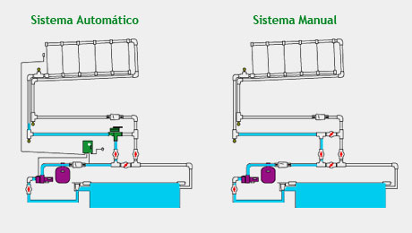 Al salir el sol, el sensor en el techo enciende la bomba de filtrado, y el agua fresca fluye hacia los colectores solares en los cuales se calienta y retoma a la pileta.